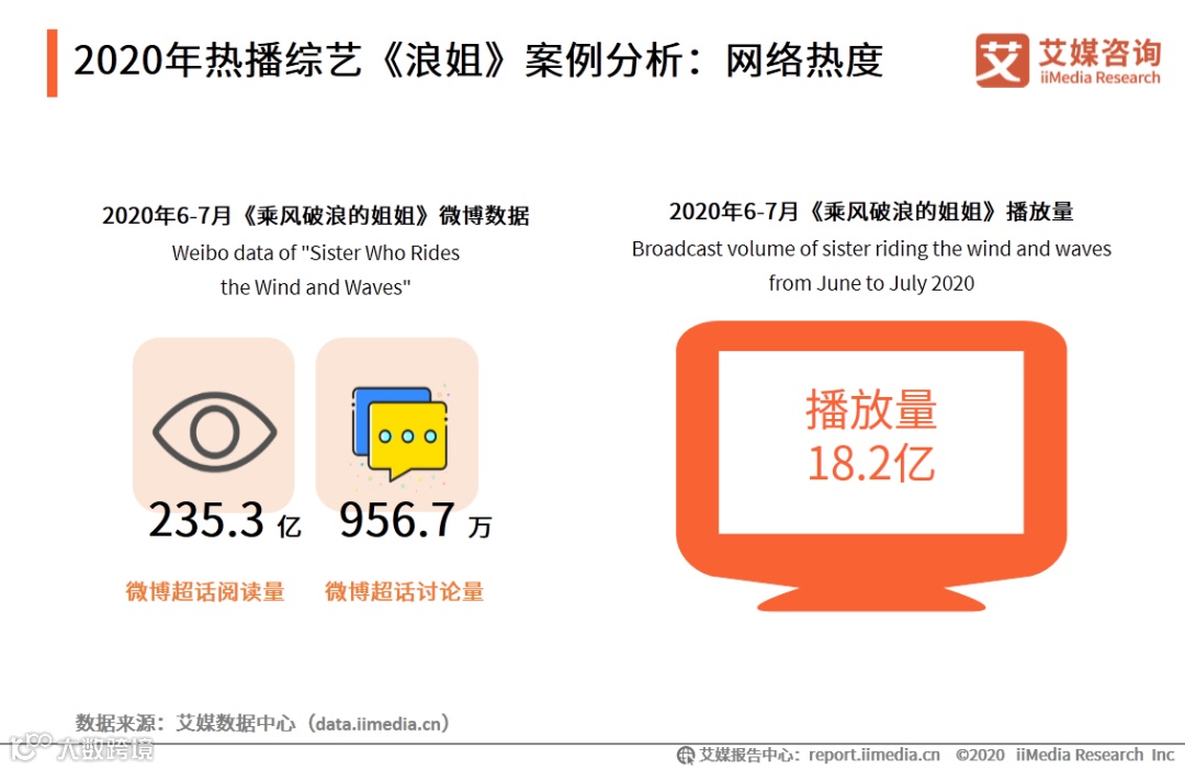 2020年6月12日,《乘风破浪的姐姐》播出后引爆网络。截至7月10号,《乘风破浪的姐姐》在芒果TV播放量达18.2亿,其微博超话阅读量达253.3亿,超话讨论量达956.7万。
