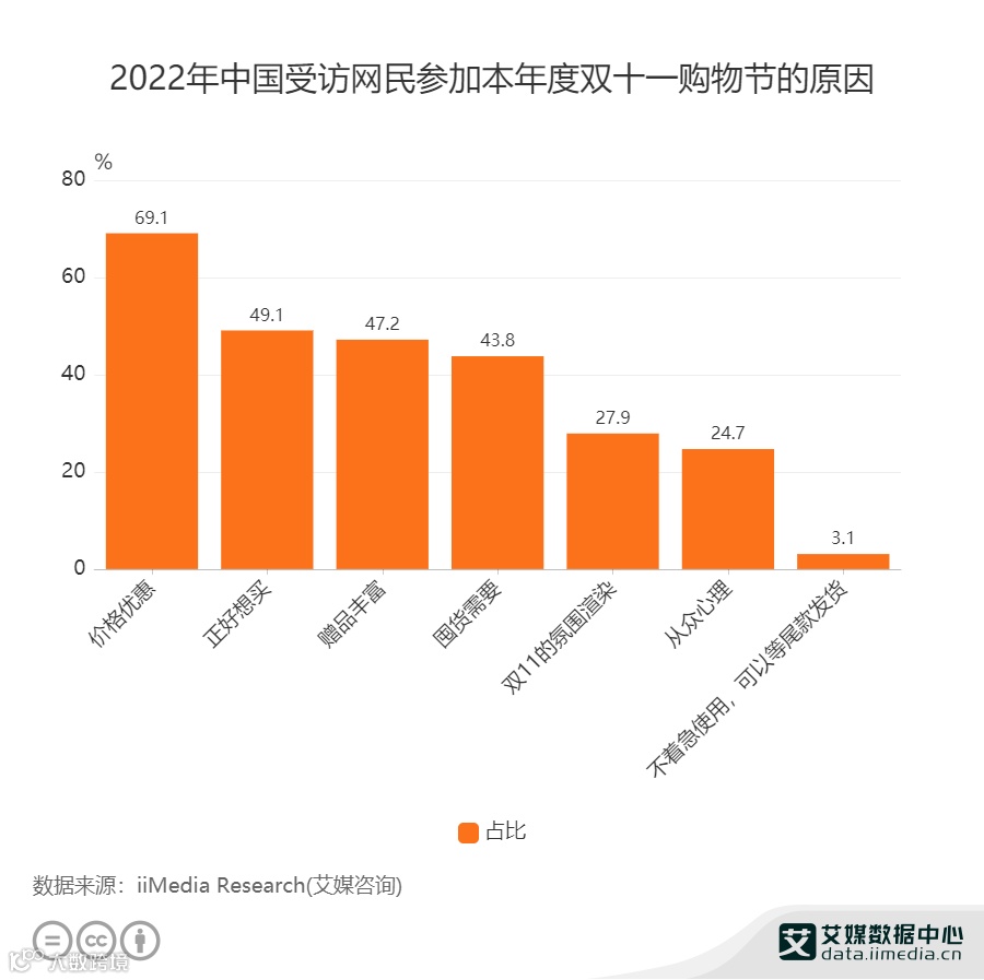 艾媒咨询数据显示,因为价格优惠而参加“双十一”的网民最多,占比69.1%。可以看出,谁把握住了价格,谁就能赢得消费者的心。“双十一”之所以能让消费者疯狂,很大原因是让消费者感觉到“占了便宜”。