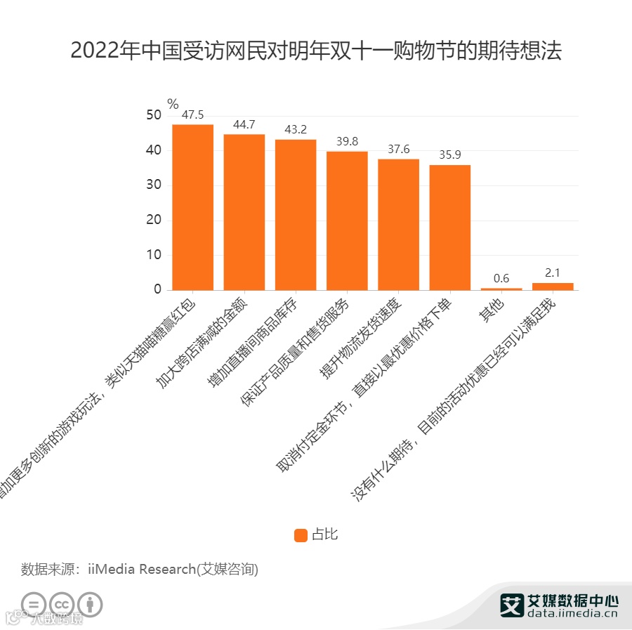 乱花迷人眼,真实惠、超简单才是消费者所求的。艾媒咨询数据显示,在对明年“双十一”的期待中,赢红包、加大满减金额、增加直播间商品库存等位列前三,由此,消费者真正需要的是简单的购物过程和实惠的价格。对于电商平台来说,要用最实惠的价格、最优质的服务,以及最快速的配送提升用户体验感,以此增加用户黏性。