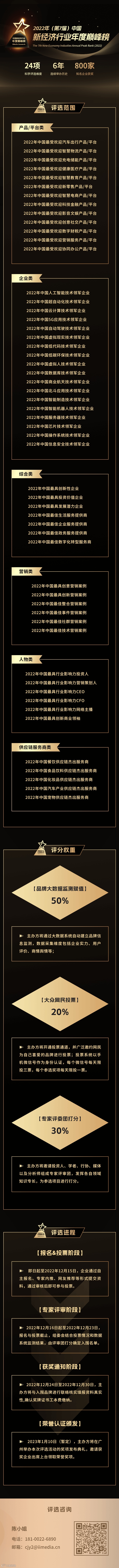 此次2022年(第7届)中国新经济行业年度巅峰榜分为六大类,共计约50个小项,通过艾媒大数据监测分析系统和独创数据模型,围绕投资价值、综合实力、发展潜力、创新能力等核心维度,最终遴选出在服务创新、企业社会责任与品牌价值等方面表现优异的产品、企业及人物。旨在通过标杆榜样的力量,进一步推动中国经济的创新与发展。