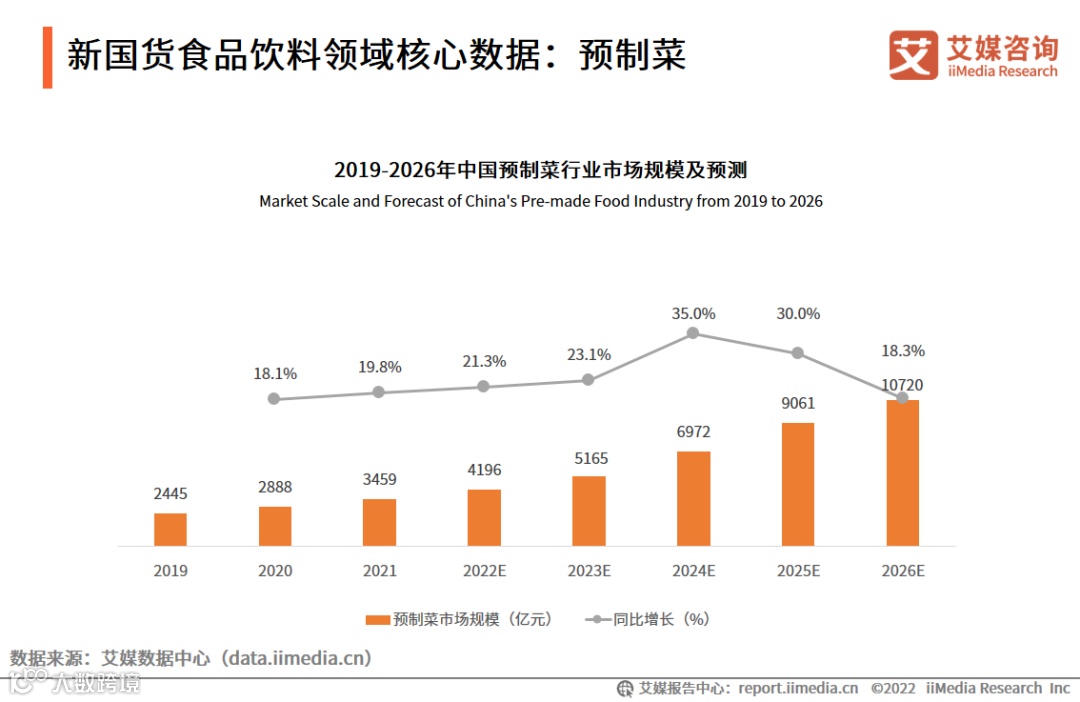 数据显示,2021年中国预制菜市场规模为3459亿元,同比增长19.8%,预计未来中国预制菜市场保持较高的增长速度,2026年预制菜市场规模将达10720亿元。