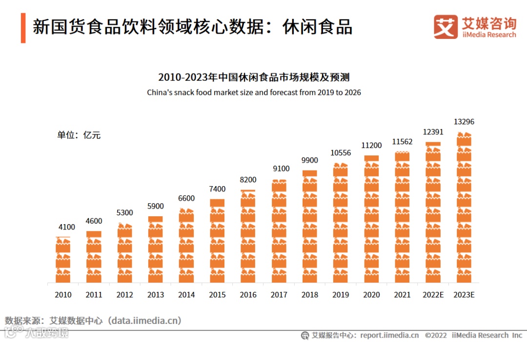 数据显示,从2010年到2021年中国休闲食品行业市场规模持续增长,从4100亿元达11562亿元,期间复合增长率约9.9%。预计2022年增速达7.2%,市场规模达12391亿元。艾媒咨询分析师认为,随着中国居民可支配收入逐年上涨,预计中国休闲食品行业市场规模未来仍将持续增长。