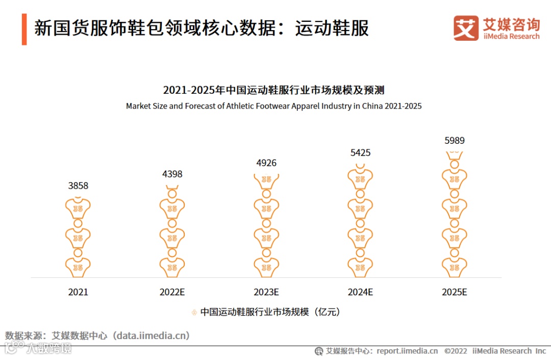 数据显示,2021年中国运动鞋服市场规模达3858亿元,预计到2025年中国运动鞋服市场规模将达到5989亿元。