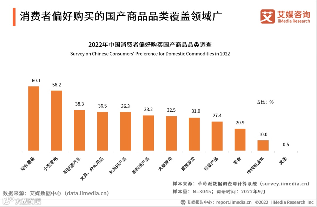 调研数据显示,消费者购买的国产商品品类覆盖较广,涉及衣食住行多个领域,其中综合服装以及小型家电是中国消费者更偏好购买的品类。近年来,通过进一步升级产品外观设计以及扩大品牌宣传,国潮品牌得到强势发展。