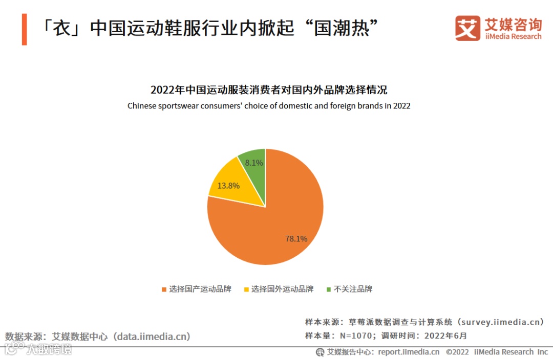 调研数据显示,中国运动服装消费者中有78.1%会选择国产运动品牌。随着中国鞋服品牌登上国际时装周舞台以及国潮文化的流行,中国运动鞋服行业内掀起了“国潮热”,国货品牌纷纷崛起。