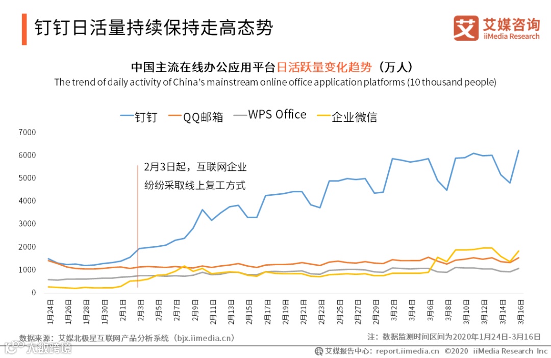 iiMedia Research(艾媒咨询)数据显示,在疫情叠加下,企业复工复产更加依赖在线办公平台,其中钉钉的用户在工作日期间日活量持续保持增长态势,2020年3月16日日活量达到6233.7万。而企业微信和WPS Office也有一定程度的增长。