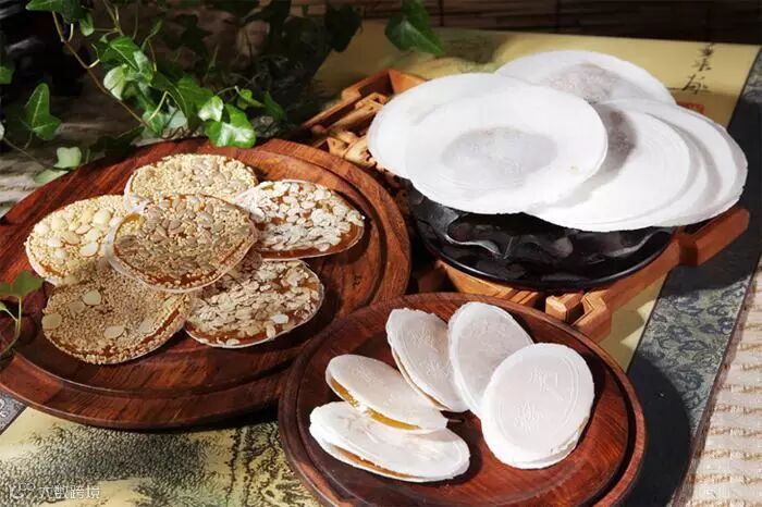 茯苓夹饼,又名茯苓饼,是北京的一种滋补性传统名点。用高级淀粉烙制的外皮,其薄如纸,其白似雪,夹心则精选多种果仁,辅以桂花、蜂蜜、白糖和纯正云贵茯苓粉,甜香味美,入口即化,清爽适口。且价格低廉,可作为经常食用的保健食品。