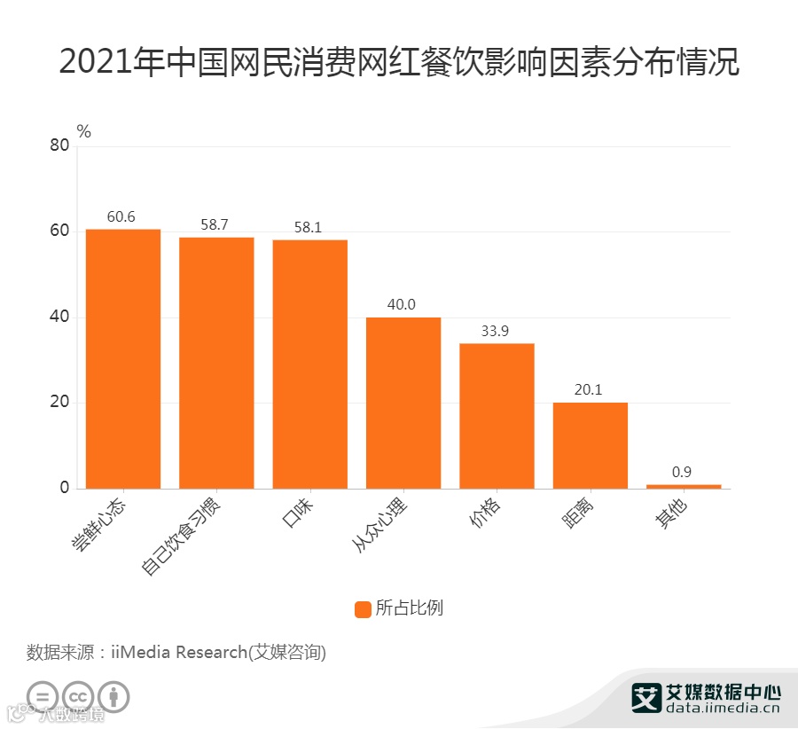 关于选择消费网红餐饮的理由,60.6%网民是出于尝鲜心态,想要品尝到 “新奇”的食物;58.7%网民则是出于自己的饮食习惯,而58.1%网民则是基于口味,此外也有40%网民是因为从众心理而选择消费网红餐饮。
