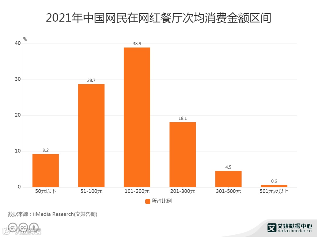 38.9%网民在网红餐厅次均消费金额为101-200元