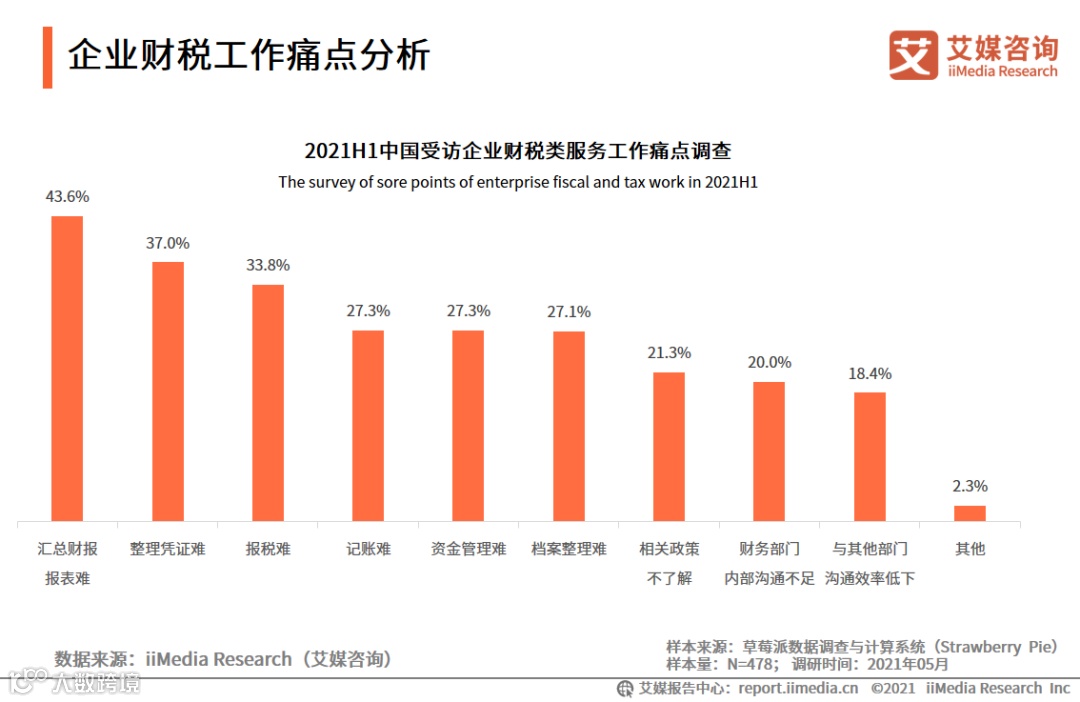iimedia Research(艾媒咨询)数据显示,“汇总财务报表难”和“整理凭证难”成为受访者眼中企业财税工作最大的痛点,分别占比43.6%和37.0%。随着国家大力推动企业财税智慧化、数字化、智能化,具有高效、成本低、错误率低等特点的财税类企业服务可以帮助企业解决上述问题,有望成为更多企业的选择。
