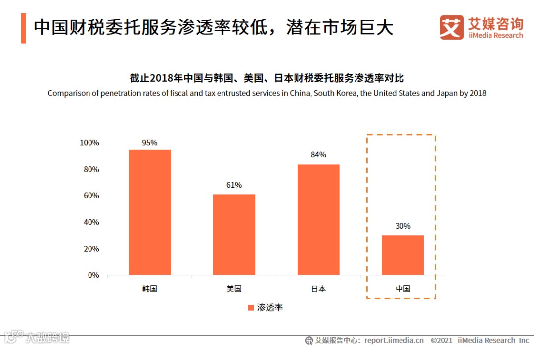 iiMedia Research(艾媒咨询)数据显示,虽然中国财税企业服务行业发展多年,但从我国及其他发达国家财税服务行业委托比例来看,韩国、美国、日本企业委托财税服务机构提供财税服务的企业数量占企业总数量比例分别为95%、61%、84%,而我国截止2018年仅为30%。这反映出我国财税服务市场渗透率较低。截止2019年底中国有企业法人超过2100万家,其中中小企业占比逾99%,财税委托服务潜在市场巨大。