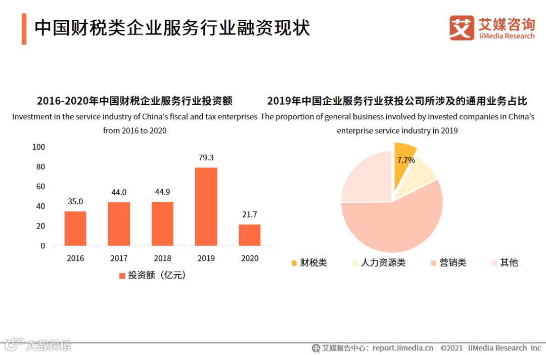 iiMedia Research(艾媒咨询)数据显示,财税类企业服务的获投比例在所有企业服务获投比例占比为7.7%。2016年至2020年,财税类企业服务获投资额稳步上升。艾媒咨询分析师认为,随着中国中小企业数量的不断增加,对财税企业服务的需求必然增加,财税类服务行业必然迎来蓬勃发展,财税类服务行业必然也会成为投融资的重点之一。
