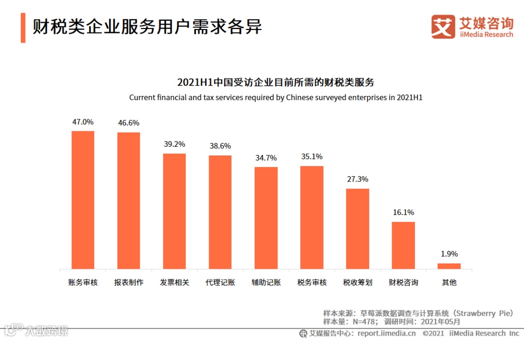 iiMedia Research(艾媒咨询)数据显示,认为所在企业需要账务审核、报表制作的占比领先,分别为47.0%和46.6%。紧随着的是辅助记账、代理记账、发票相关、税务审核传统财税类企业服务。艾媒咨询分析师认为,目前企业需求的财务服务主要集中于传统记账、审核需求,而报表制作作为高频以及需求碎片的功能,有望成为财税类企业服务平台打开市场主要切入口。