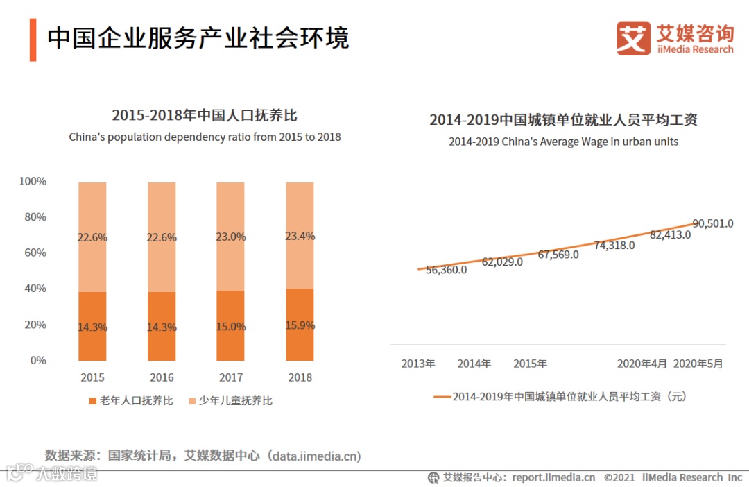 iiMedia Research(艾媒咨询)数据显示,2019年,16-59岁的劳动人口占总人口的64%,而15岁以下人口只占17.8%,加之少年儿童抚养比和老年人口抚养比不断增加,从22.6%和14.3%(2015年)增加到23.4%和15.9%(2018年)。而中国城镇单位就业人员平均工资逐渐上升至2020年5月的九万人民币。随着人口红利的消失加之劳动力成本不断攀升,过去粗放的增长模式不再适合新的市场环境。对于一些人工成本高、协同难度大的劳动密集型产业,如记账等,使用企业服务实现降本提效将成为市场主流。