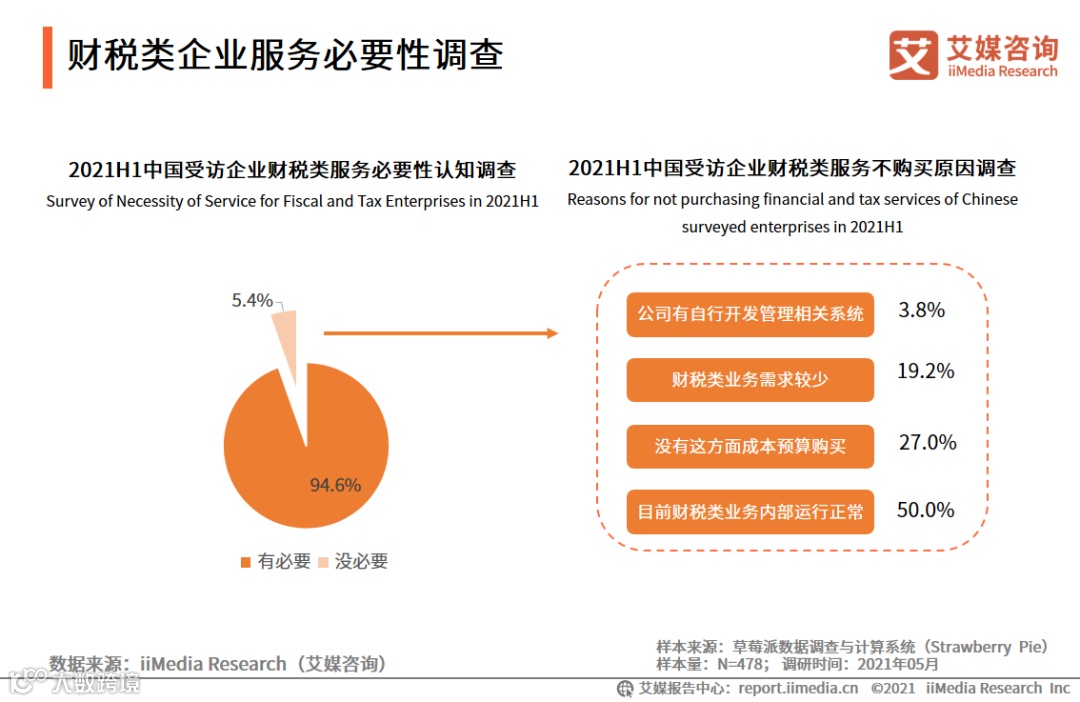 iimedia Research(艾媒咨询),财税类企业服务低成本、高效的特点已深入人心,有94.6%的受访者表示其所在企业有必要购买财税类企业服务。而在不需要购置调研中,过半受访企业认为内部财税业务运行正常暂无需求。艾媒咨询分析师认为,财税类企业服务价值已获得大多企业认可。另外,整体财税服务专业化意识仍需提升,助力更多企业在财税业务上实现降本增效。