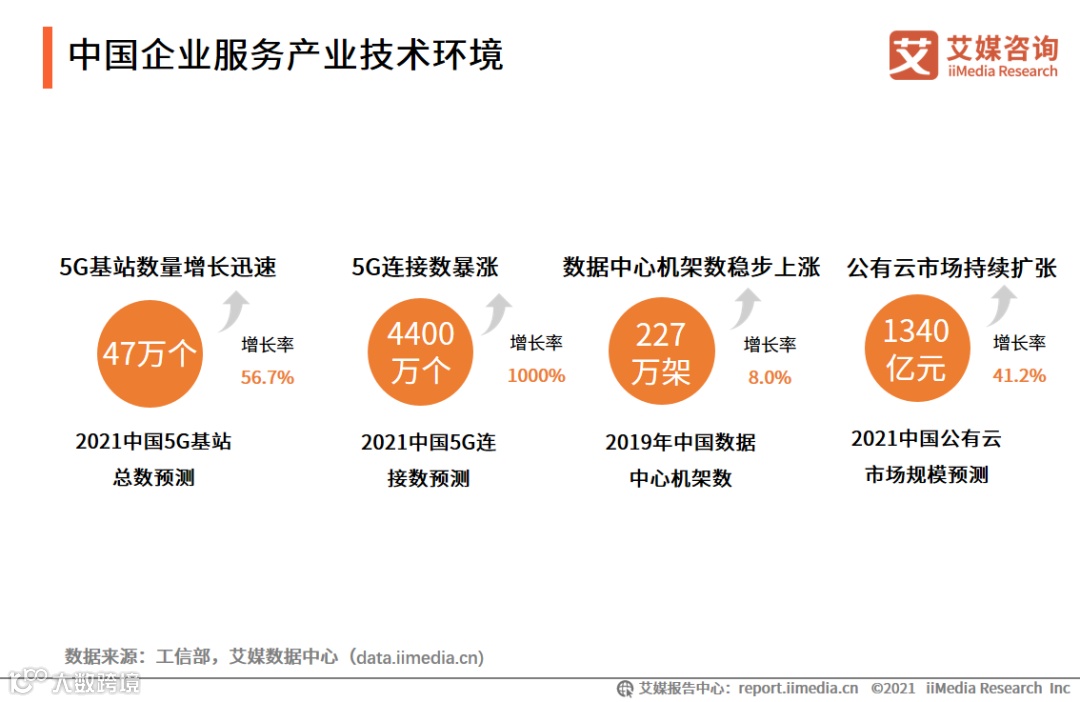 iimedia research(艾媒咨询)数据显示 ,2021年中国5G基站总数和5G连接数预测分别高达47万个和4400万个,增长率分别达到56.7%和1000%,中国数据中心机架数也稳步上涨至2019年的227万架,而公有云市场规模预测将在2021年达到1340亿元。5G技术、大数据、公有云等新技术的建设和普及加速完善为企业服务行业的精细化、智能化和个性化的行业变革提供了技术基础,企业服务行业潜力有望进一步释放。