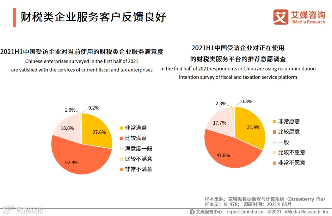 iiMedia Research(艾媒咨询)数据显示,80.0%的受访者反馈所在公司比较满意或非常满意当前使用的财税类企业服务,79.7%的受访者所在企业比较愿意把正在使用的财税类服务平台推荐给其他企业。艾媒咨询分析师认为,大多数财税类企业服务使用者对于目前所使用的财税服务满意度较高,当前市场上财税类企业服务基本能满足企业需求。