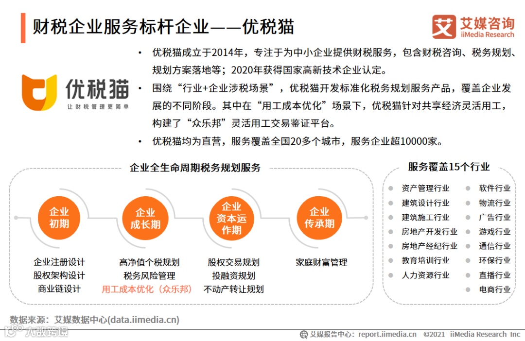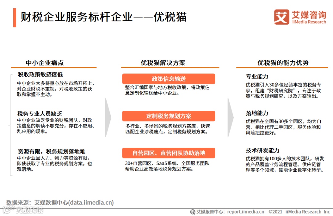 艾媒咨询分析师认为,相对于代账报税等基础服务,税务规划对服务商的要求更高,既需要专业的规划方案,也需要丰富的落地实战经验。优税猫自建财税研究院、自建技术团队、自营园区,在历经多行业、上万家企业的服务积累之后,构建了专业、标准、成熟、多场景的持续服务能力,这在应对中小企业渴望长期发展的需求上更具有优势,相较于解决单一场景的其他入局者也更能从商业底层全面赋能企业发展。