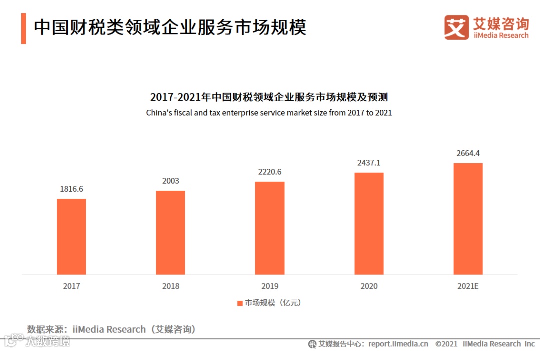 iiMedia Research(艾媒咨询)数据显示,随着财税数字化的推进,中国财税领域企业服务市场规模逐步上涨,从2017年的1816.6亿元上涨至2020年的2437.1亿元,增速逐渐放缓,预计在2021年将涨至2664.4亿元。艾媒咨询分析师认为,近年来全国市场主体企业数量依然保持增长,给财税领域企业服务市场提供持续的客户源。凭借政策和技术双重利好,预计市场规模将保持扩张。