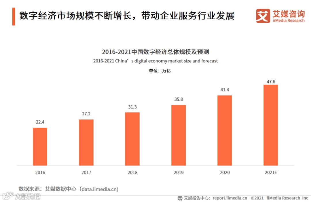 iiMedia Research(艾媒咨询)数据显示,2016年以来中国数字经济总体规模持续上升,截至2020年,规模高达41.4万亿元。艾媒咨询分析师认为,随着国内数字经济的规模和技术水平不断发展,精细化和个性化服务将成为新的市场需求。在数据采集自动化技术日益增强的情况下,服务供应方有望打通企业主体和服务商间的数据壁垒、扩大服务半径,为企业服务市场规模增长带来新的驱动力。
