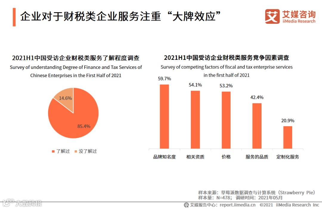 iiMedia Research(艾媒咨询)数据显示,财税类企业服务经过数年的发展,已获得了一定社会认知基础,85.4%的受访企业表示了解过财税类企业服务平台或应用。其中,首要考虑因素为品牌知名度及其相关资质。艾媒咨询分析师认为,当前财税类企业服务市场仍处于较为初级发展阶段,品牌效应有望为市场知名度高的企业带来一定的竞争优势。