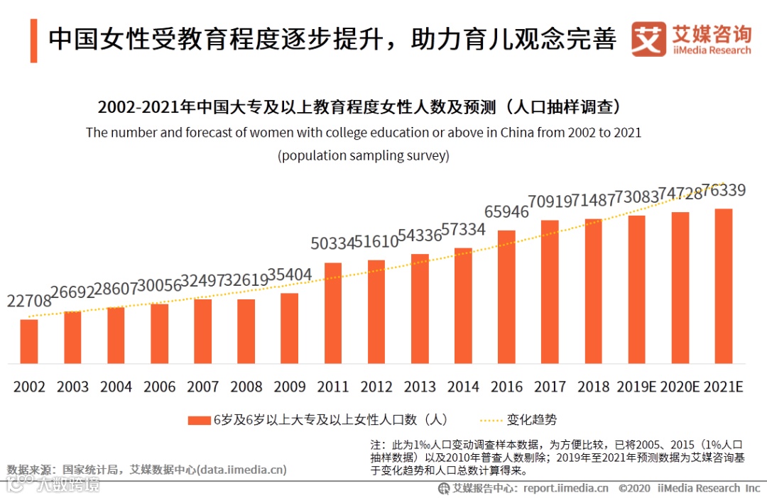 图表1:2002-2021年中国大专及以上教育程度女性人数及预测(人口抽样调查)
