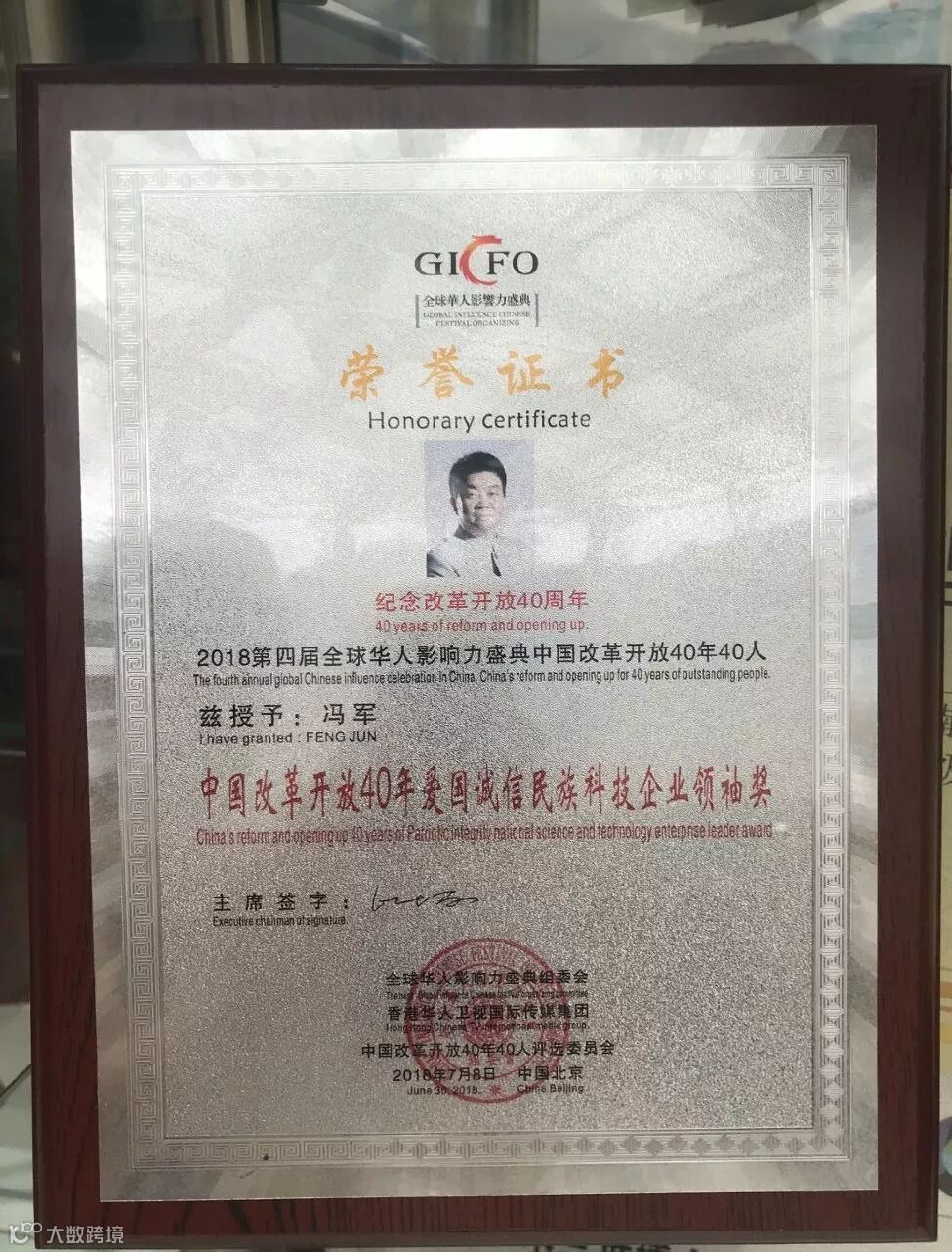 △中国改革开放40年爱国诚信民族科技企业领袖奖荣誉证书