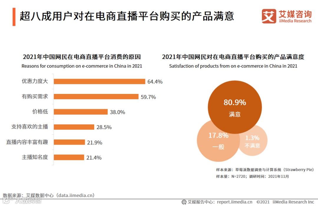 iiMedia Research(艾媒咨询)数据显示,优惠力度大是受访网民在电商直播平台消费的主要原因,占比64.4%;超过八成的用户对在电商直播平台购买的产品满意。艾媒咨询分析师认为,电商平台通过网红或明星带货直播,增加与消费者的互动,而且产品价格优惠,提升了消费者的满意度。