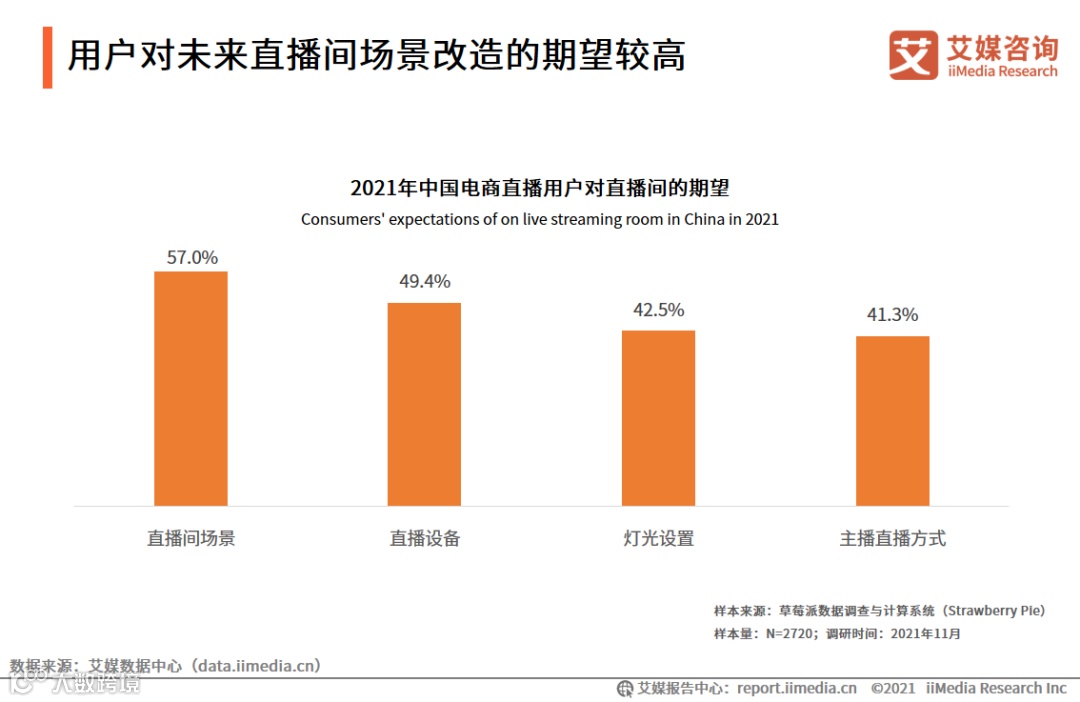 iiMedia Research(艾媒咨询)数据显示,57.0%的受访网民认为直播间场景需要改进;直播设备不够完善目前直播间存在的问题之一。艾媒咨询分析师认为,多情景化的直播间场景布置和先进的设备技术是电商直播的有力保障,能实现商品到消费者的高效触达。