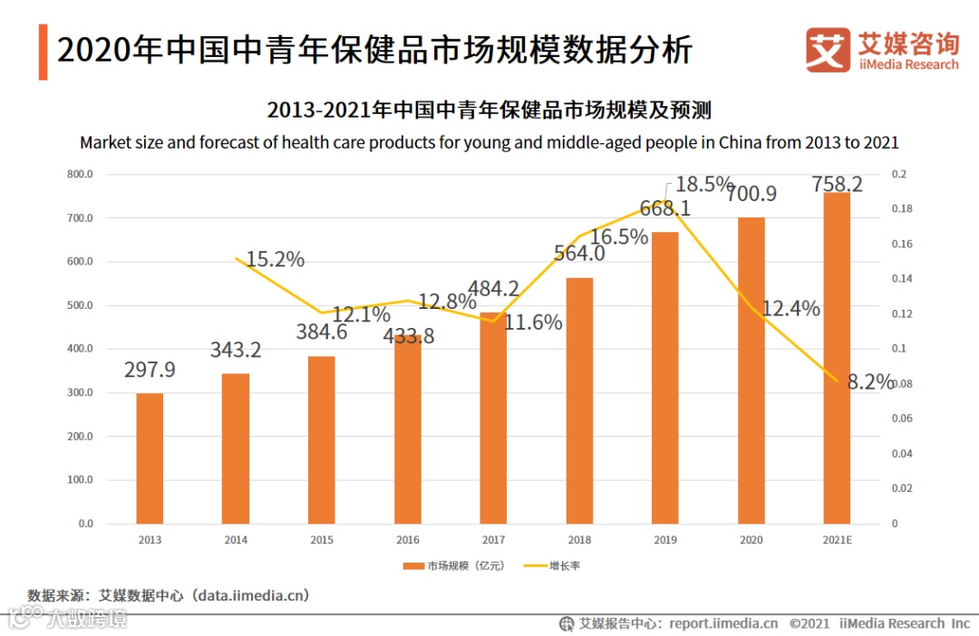 中青年对保健品的需求增加推动市场规模持续扩大。数据显示,2013年到2020年中国中青年保健品市场规模在持续增长,增速多维持在10%以上,不及老年保健品市场。2020年中国中青年保健品市场规模达到700.9亿元,同比增长12.4%,预计到2021年市场规模将增至758亿元。