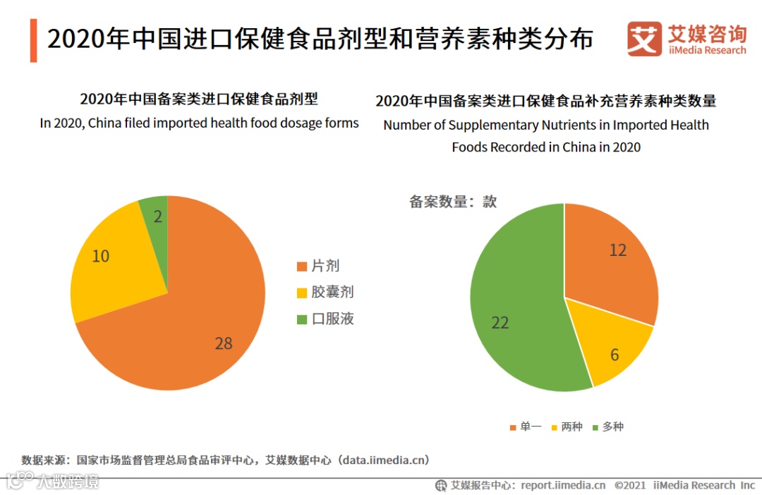 进口保健品以片剂为主,功能集中补充多种营养素。数据显示,从产品剂型来看,2020年进口保健食品备案产品中片剂有28款(包括8款咀嚼片、20款普通口服片剂),胶囊剂有10款(胶囊5款、软胶囊5款),口服液有2款。从产品补充营养素种类数量来看,补充多种营养素的产品占多数,其次是补充单一营养素的产品。