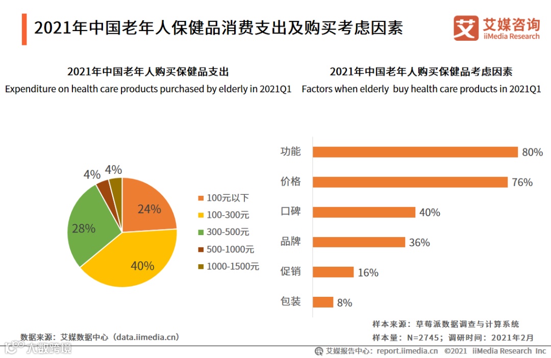 2021年中国老年人保健品消费支出及购买考虑因素