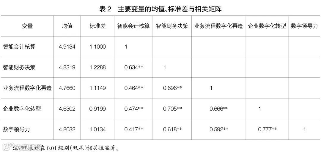 本文使用Person双侧检验进行均值与相关性分析,结果如表2所示。各测量变量均值介于4.63—4.92之间,与期望相符,处于“一般符合”范畴。由Person系数可知,智能会计核算、智能财务决策、业务流程数字化再造、数字领导力与企业数字化转型显著正相关。