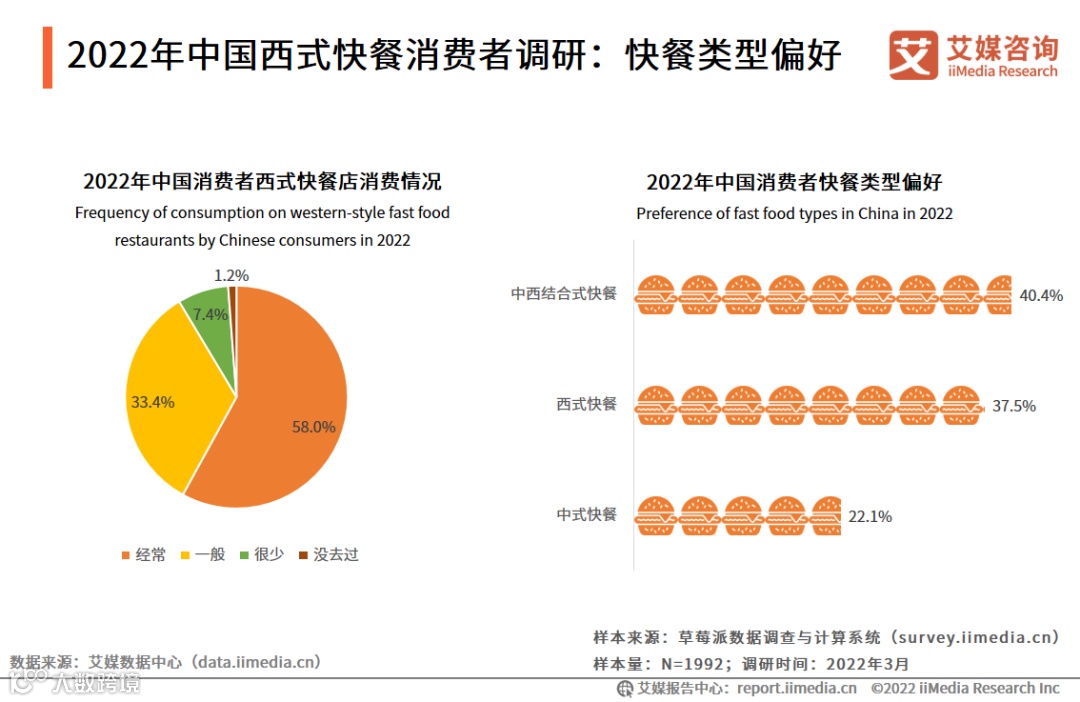 iiMedia Research(艾媒咨询)研数据显示,超过五成的受访消费者经常在西式快餐店消费,有40.4%的受访消费者偏好中西结合式的快餐。