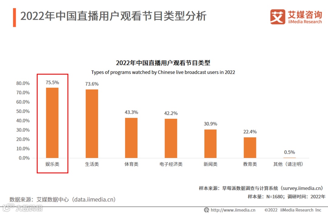 iiMedia Research(艾媒咨询)数据显示,2022年,中国直播用户最常观看的节目类型是娱乐类,比例为75.5%;其次是生活类,比例为73.6%;43.3%和42.2%的中国用户会选择观看体育类和电子经济类。