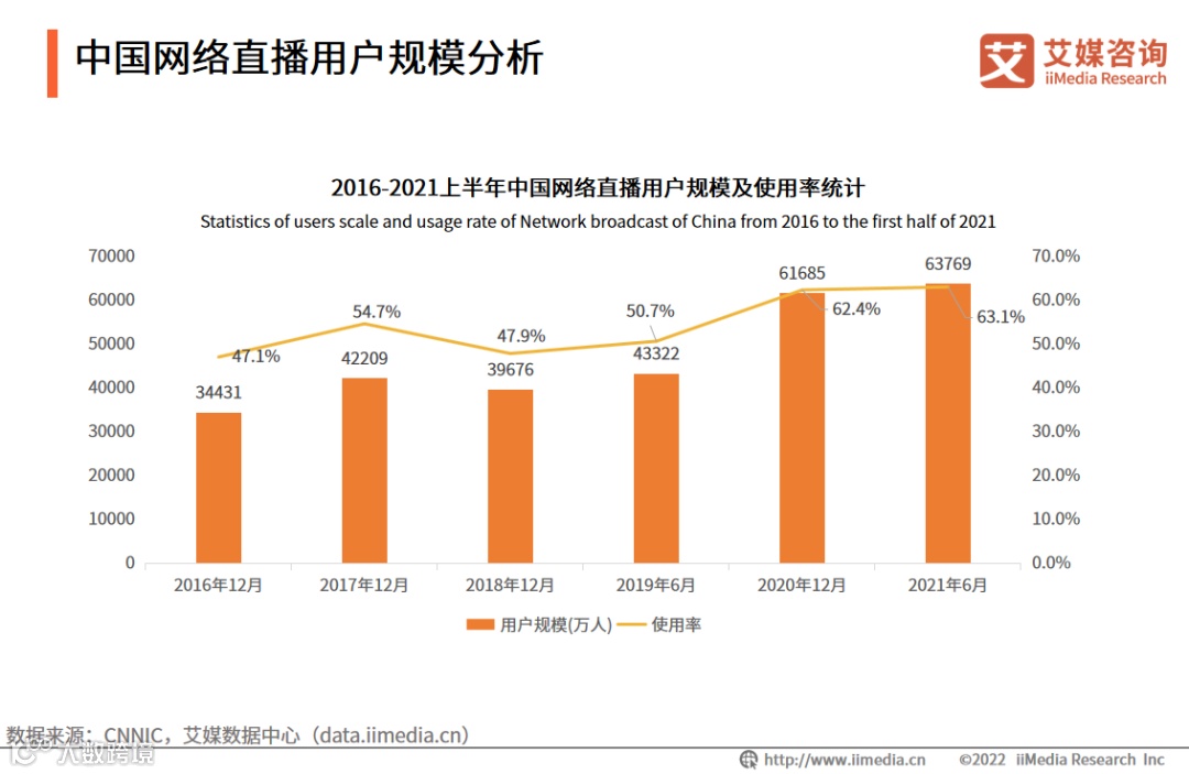 iiMedia Research(艾媒咨询)数据显示,截至2021年6月,我国网络直播用户规模达6.38亿,与2020年同期相比增长47.2%,占网民整体的63.1%。