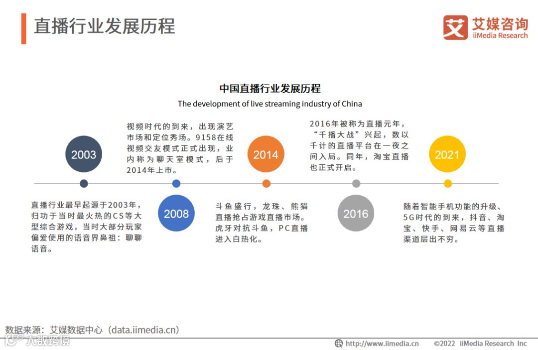 中国直播行业最早起源于2003年,随着视频时代的到来,2012年,直播秀场三巨头正式形成:聊天模式的9158、六间房和演唱会模式的YY。2014年,斗鱼、虎牙等多家直播平台接连入场。智能手机功能的升级、5G技术的发展,使得全民直播时代到来。