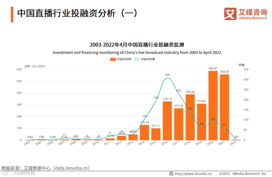 iiMedia Research(艾媒咨询)数据显示,中国直播行业投融资数量集中在2016年,全年高达309起。2021年中国直播行业全年投融资金额为559.6亿元,投融资数量达61起。