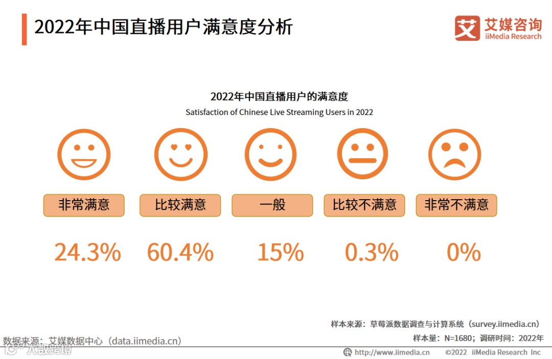 iiMedia Research(艾媒咨询)数据显示,24.3%的直播用户对直播行业表示非常满意,60.4%的直播用户表示比较满意,但仍存在对直播不满意的用户。