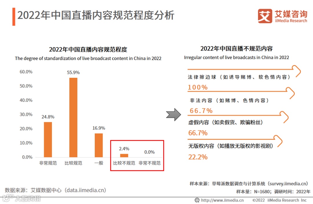 iiMedia Research(艾媒咨询)数据显示,中国直播用户认为直播内容规范程度较高,超八成的用户认为直播内容较为规范。100%的直播用户认为目前存在法律擦边球(如诱导赌博、软色情内容)的行为;非法内容和虚假内容也是常见的直播不规范内容。