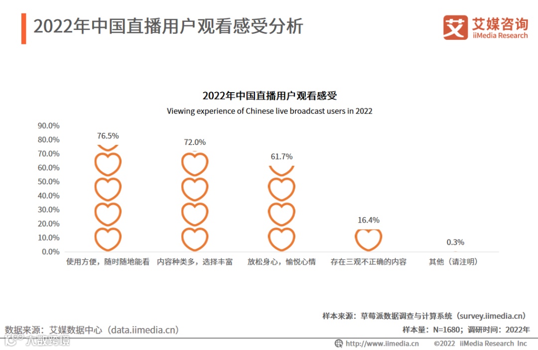 iiMedia Research(艾媒咨询)数据显示,76.5%的中国直播用户观看直播的感受是使用方便、随时随地能看;72.%的中国直播用户认为其内容种类多、选择丰富;61.7%的中国直播用户认为直播可以放松身心、愉悦心情;仅16.4%的用户认为直播存在三观不正确的内容。