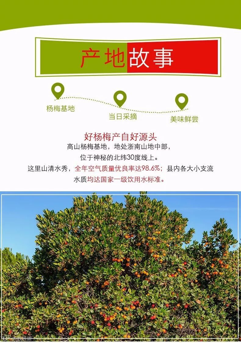 1、杨梅采摘期一般只有短暂的15天,一旦错过就只能等到来年。