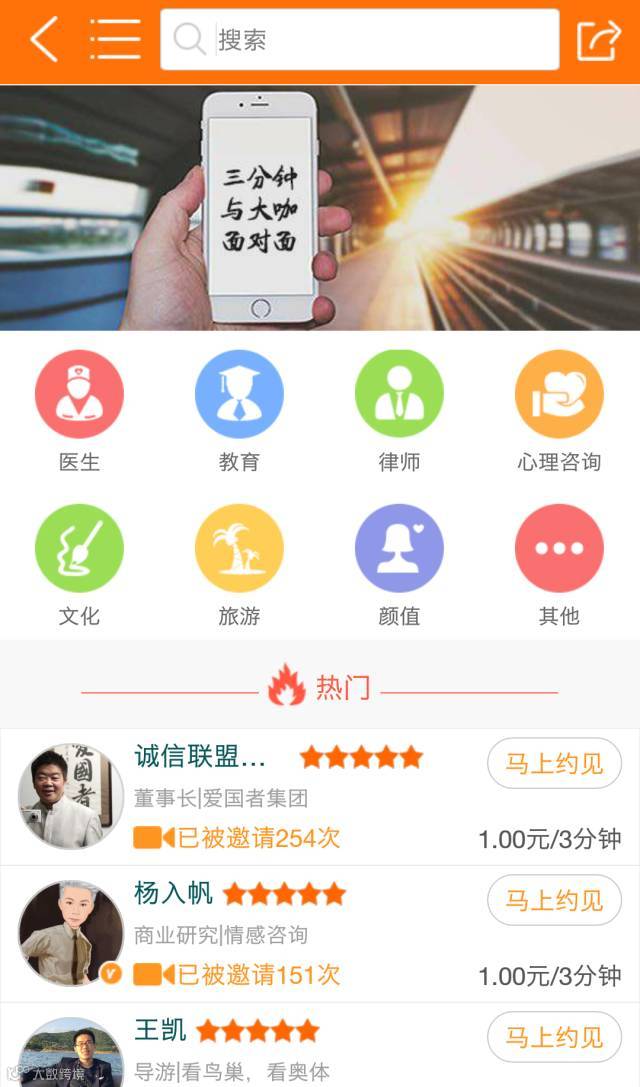 “约见”,定位于“国内领先的视频聊天问答平台”,能够帮助用户快速找到提供需求的那个人,用一对一视频的方式为用户答疑解惑。“约见”行业大咖牛人,来为你分享知识,帮你节约更多时间,也可以让你在这些时间里去玩转更多的东西,吸收更多的知识。在知识付费的时代,通过“约见”约你想见,为自己充电。