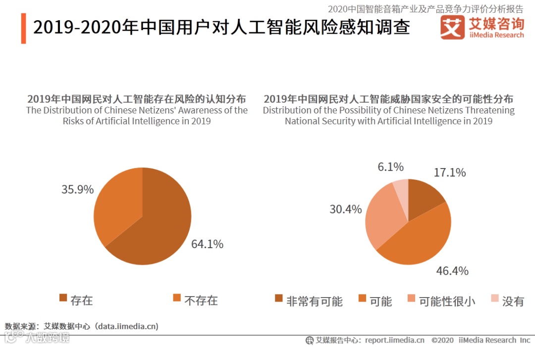 iiMedia Research(艾媒咨询)数据显示,2019年64.1%中国网民认为人工智能存在风险,并且46.4%的网民认为人工智能可能会威胁到国家安全。艾媒咨询分析师认为,由于中国网民对人工智能有一定的风险认知,部分消费者还是会对包括智能音箱在内的人工智能类产品持谨慎态度。