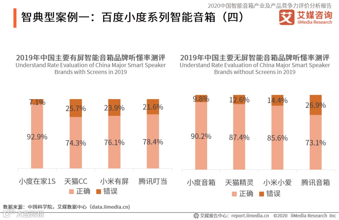 根据中国科学院测评数据显示,在对智能音箱的听清率测评上,总体四个品牌的智能音箱的听清率都达到90%以上,其中百度旗下的小度音箱排名第一,无论是有屏还是无屏系列的智能音箱听清正确率均达到98%以上。天猫、小米和腾讯旗下音箱听清正确率不相上下。