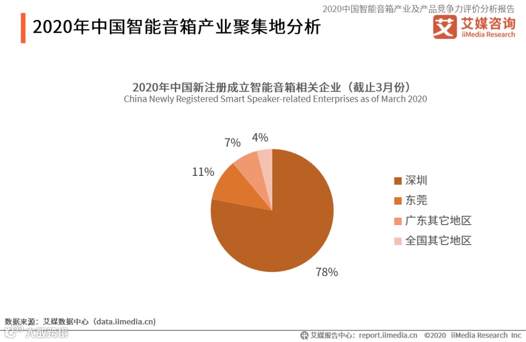 iiMedia Research(艾媒咨询)数据显示,目前全国共有超过1万家的智能音箱企业,90%以上企业在广东省注册成立。2020年起截止3月份,中国大约有27家智能音箱相关的企业注册成立,其中96%位于在广东省,78%新注册公司在深圳市登记。艾媒咨询分析师认为,由于大湾区的发展和深圳政府对人工智能等高新技术的政策支持,深圳市将成为智能音箱产业聚集地之一。