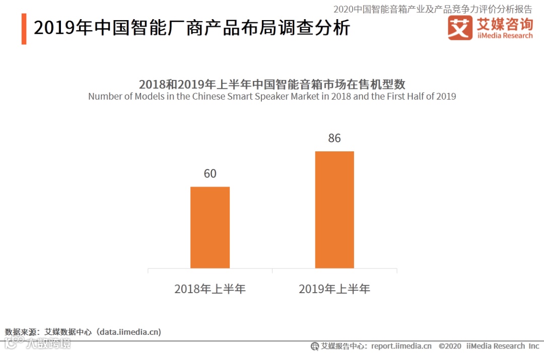 iiMedia Research(艾媒咨询)数据显示,2019年上半年中国智能音箱市场在售机型数达到86个,比去年上半年增加26了个机型。艾媒咨询分析师认为,智能音箱厂商开始布局多样化的产品矩阵,以满足不同用户群体需求。