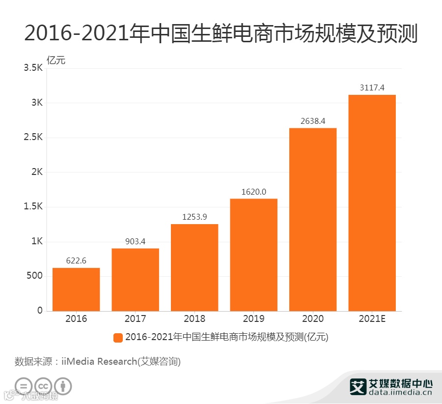 数据显示,2020年中国生鲜电商市场规模为2638.4亿元,预计2021年将实现“3”的突破,达到3117.4亿元。