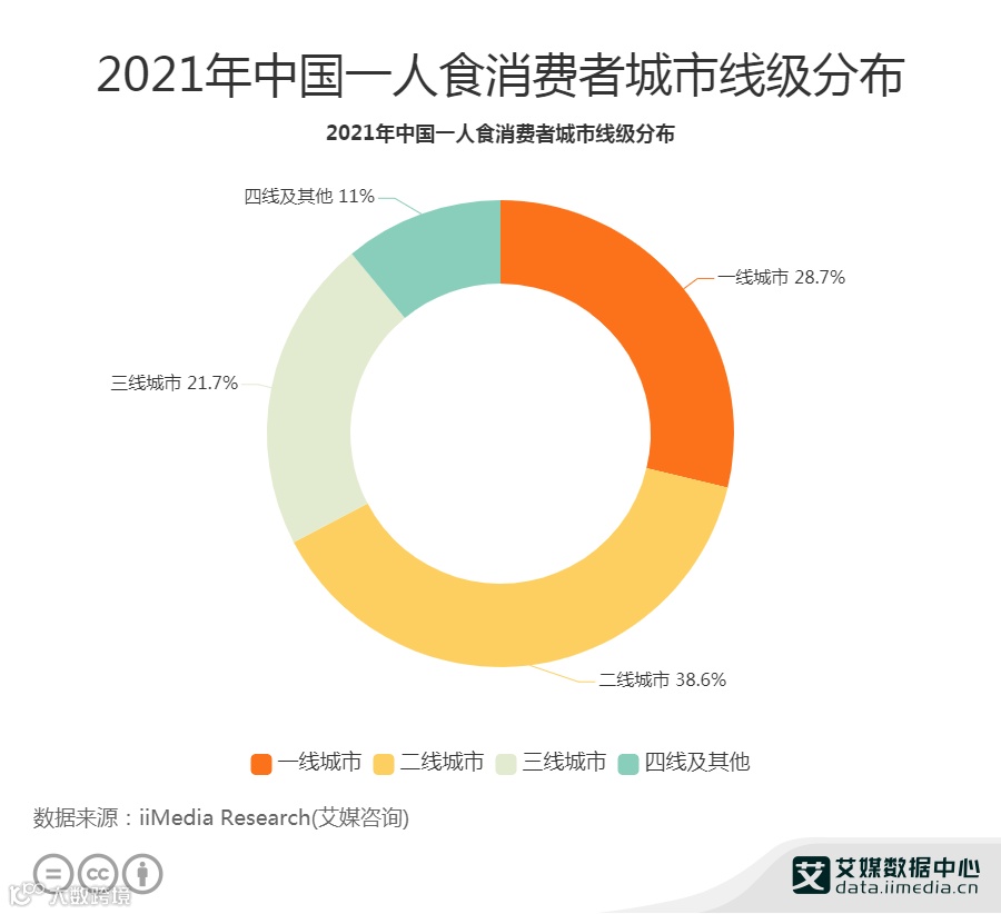 从城市线级分布来看,一人食消费者主要分布在一、二线城市。数据显示,2021年中国38.6%一人食消费者分布于二线城市,而28.7%一人食消费者分布在一线城市。