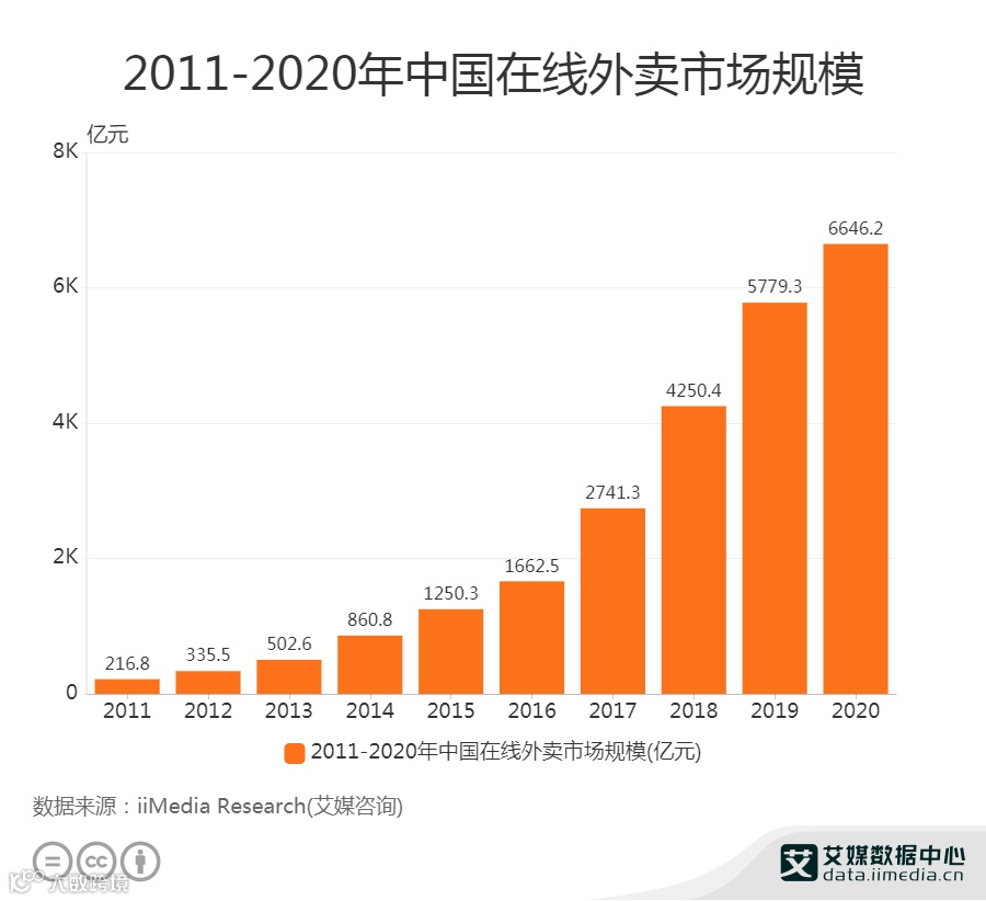2020年中国在线外卖市场规模达6646.2亿元